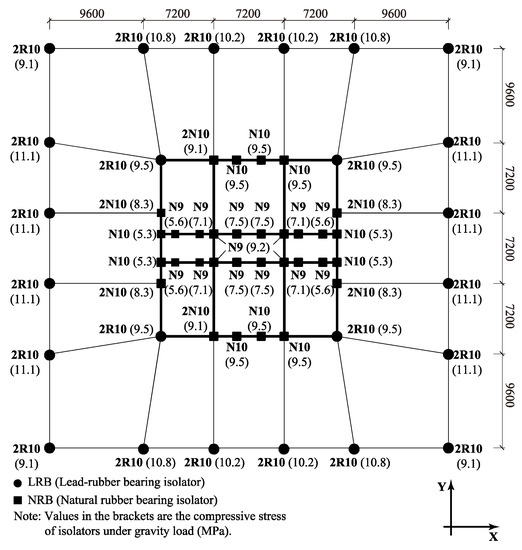 Based on the above, LRB isolators are adopted for the isolators under the columns and the corner of the core tube, while NRB isolators are adopted for other isolators as shown in Figure 14. The yield ratio calculated has a value of 2.3%, which lies in the proposed rational range of the yield ratio (i.e., 2–3%), indicating that there is no need to add other LRB isolators. Then, the eccentricity of isolation system is calculated to have the values of 0.0043% and 0.0007% in the X and Y directions, respectively, which are both lower than the limit of 3%.