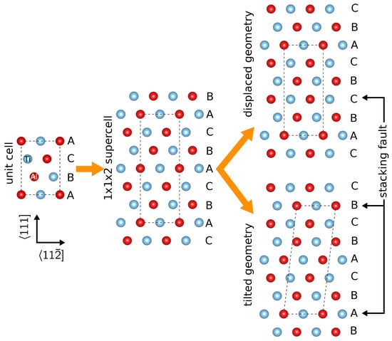 One possible approach for simulating SFs is to build a supercell of cells having the fault planes perpendicular to the lattice vector. Subsequently, a section of the supercell is displaced in the plane (fault plane) so as to produce an SF with , and if necessary, a layer is removed in order to restore the periodic boundary conditions (Figure 1). In some cases (e.g., APB), this approach implies that there are two SFs per supercell.