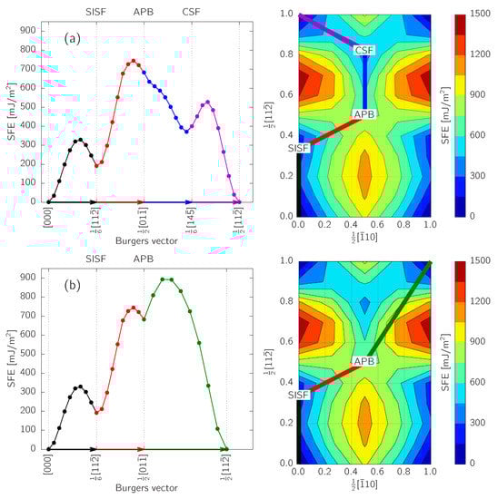 This energy can be calculated not only for the special translations corresponding to SFs as described above, but for any displacement vector , hence yielding the generalized stacking fault energy (GSFE) surface []. In addition, to the actual values of SFEs, the GSFE surface contains also energy barriers that need to be overcome when an SF is created. In this work, we discuss SFs on the planes; hence, GSFE surfaces are evaluated along u and v coordinates decomposing . It is worth noting that generalization of ESF for the L structure yields the superlattice extrinsic stacking fault (SESF), which is, however, not compatible with a single shear plane. Since it is not contained by the simple GSFE surface, it will not be discussed any further in this work. For similar reasons, we do not include twin boundaries or APBs on the planes.