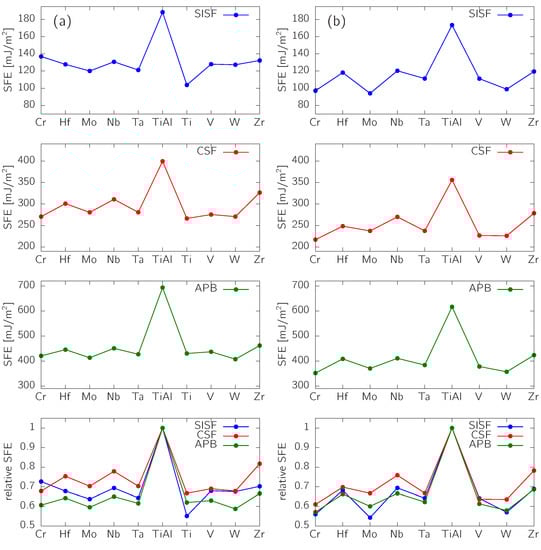 The SFEs are predicted to significantly decrease by 20–40% as a result of the alloying (see Figure 3a; atomic positions were relaxed only in the direction perpendicular to the fault plane). Regarding the SISF, the biggest impact has Ti simply leading to a bigger Ti/Al non-stoichiometry () in comparison with the ternary systems (). From the ternary additions, the most pronounced effect has Mo ( drops by 36%) closely followed by Ta. The largest reduction of the CSF energy is caused by Cr, V and W, while the APB energy is most significantly decreased by Mo and W. The relative reduction of SFEs is even more pronounced when the full atomic relaxation is performed (Figure 3b).