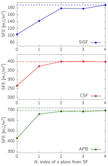 Dependence of SFEs on the location of the substitutional atom (here, Ti). N labels the layer number away from the fault plane (located at ), and the dashed line represents a reference value for the stoichiometric TiAl (Table 1).