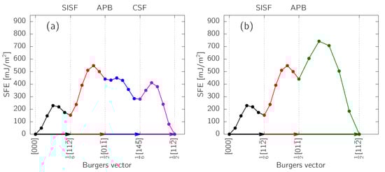 The -TiAl phase has an L1 structure which is a tetragonally strained fcc lattice with planes occupied alternatively by Ti and Al atoms. Therefore, stacking faults (SFs) become a topic of a great importance, similar to fcc metals, in which a stacking fault is a deviation from the normal stacking sequence of the planes. The stacking fault energy (SFE), , an energy stored by the stacking fault defect, has a huge impact on a plastic deformation behavior of fcc metals. It determines the spreading of dissociated partial dislocations and, therefore, influences the cross-slip properties of screw dislocations. It is observed that metals with smaller stacking fault energies exhibit more mechanical twinning whereby they possess an additional deformation mechanism []. Especially, this effect was utilized in the development of novel high-strength -TiAl-based alloys exhibiting a certain ductility at room temperature. Here, the reader is referred to [,] and the papers cited therein.