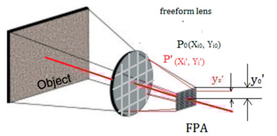 There are many ways of describing the freeform surface to more effectively match the rectangular characteristics of the refractive IR detector. The imaging freeform optical systems have been designed using non-uniform rational basis-spline (NURBS) surfaces in Reference [30]. It has a dense sampling grid close to the freeform surface and uses an optimization algorithm relying on point-by-point control, but the NURBS freeform design for the off-axis refraction system is not suitable for our optical system because the initial structure of this freeform lens does not need to be set up. In the whole coaxial refractive optical system, it still shares the same optical axis, combined with our field sampling method, so the system is still plane-symmetrical that the initial structure of the freeform lens is automatically set up. Herein, the XYP surface to describe the freeform surface system has been adopted. First, according to the way of sampling, XYP surface can calculate the actual ray height of each sampling point Pi(Xi, Yi) to control the system aberration to meet the design requirement. Second, due to this freeform surface retaining its plane-symmetric character, the XYP surface can save optimizing time. This extended polynomial is a monomial extension, which increases the number of supreme power series based on the conic coefficient, as shown in Equation (2) [29].