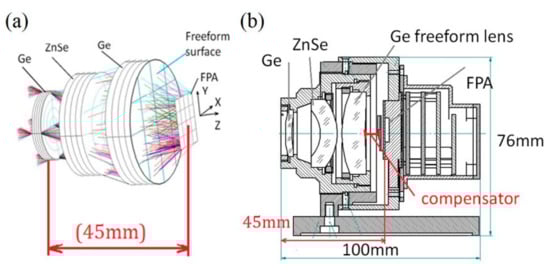 In this study, we aimed to design a high-performance, long-wave, un-cooled, refractive IR thermal imager with F# 1 and the FOV (40° × 30°). A freeform lens is implemented to achieve the correction of the distortion of the optical system. Figure 2 illustrates the configuration of the optical system which consists of several spheres and one freeform lens. In the 8–12 μm band, Ge, ZnSe, and ZnS are the most commonly used materials. The system consists of three lenses, which are Ge, ZnSe and Ge in turn. The stop is set on the first surface of the first lens Ge. Except a freeform surface is set on the last Ge lens, the rest of the surfaces are all spheres. It can be seen from Figure 2a that the total length is only 45 mm from the first surface to the focal plane array (FPA). The freeform surface is shown with grids rather than cycles in this scheme because of its asymmetric form. The system assembly is considered in the design process, as shown in Figure 2b. Herein, the distance between the last lens and detector is called the compensator, which is changed by moving the last lens forward and backward. During the design process, the movement is controlled within 1 mm to keep the system performance within tolerance.
