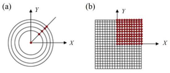 Sampling points diagram. (a) Rotating axis-symmetric system and (b) XYP orthogonal system.