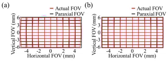 From the comparison of the different simulation pictures, we can find that freeform lens has stronger aberration correction capability (Figure 5a,b). On one hand, it can make the imaging effect match the detector’s shape. The relative distortion value q′ in freeform refractive optical system is 1.9% and q′ in aspheric refractive optical system is 6.1%. Although the actual ray height at the margin of the field on the image-plane is optimized from Pi(4.45, 6.08) to Pi′(4.66, 6.34), sure to use only traditional aspheric surfaces are not enough, the use freeform surface can achieve better results.