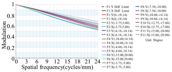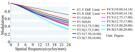 On the other hand, the MTF is a frequency domain representation of a spatial domain signal and it contains complete information about the spatial resolution. Because of aberration, not including distortion, the MTF of actual optical system will decrease with an increasing spatial frequency until the cut-off frequency. This is reason why MTF can be used to evaluate the quality of optical systems imaging. When spatial frequency is 26 cycles/mm, it can be inferred from Figure 6 and Figure 7 that MTF in freeform refractive optical system is 48% and MTF in aspheric refractive optical system is 30% at the same margin of the field.