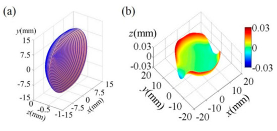 (a) Ge freeform surface sag map with machining tool path and (b) distribution of fluctuation in the sagittal direction Δd.