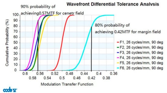 If it is assumed that the errors can only take extreme values of the tolerances, the 97.7% probable change in the MTF is −0.0462 in the central FOV and −0.0555 in the marginal FOV. The particular tolerance results show that the performance of final system thermal image can maintain the design simulation value very well.