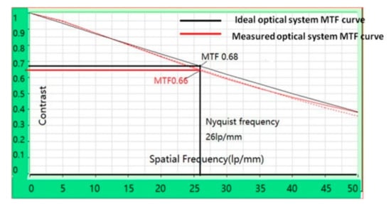 Reasonable results have been obtained, and test conditions are shown in Table 5. The measurement parameters of image vs. object angle is shown Figure 10. The black numbers represent the nominal value and the red ones represent the measurement results. The test results showed that the distortion of the system was less than 0.7% from the center field (0, 0) to (10, 3.1). As the field of view increases, the distortion becomes more and more difficult to control. However, the distortion of the system at the maximum marginal field was also controlled within 2%. On the other hand, the MTF test value is shown Figure 11. The black curve means nominal value and the red curve means the measurement results. The MTF value is 0.68 at 26 cycle/mm, the consistency of the two curves keeps fairly satisfying. It is indicated that the aberration correction of the actual optical system is better, and the MTF does not decrease as the spatial frequency increases until the cut-off frequency 26 cycle/mm. The Ge freeform surface plays an effective role in the aberration correction of this IR system.