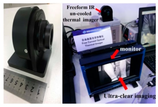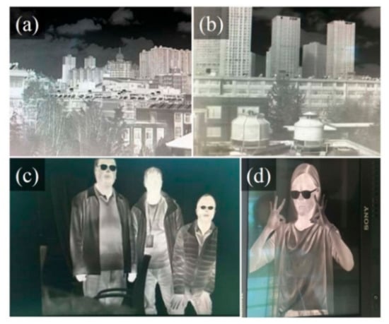 Moreover, for the thermal imager systems, a combination of both spatial resolution and thermal sensitivity determines the final system performance. The minimum resolvable temperature difference (MRTD) combines the spatial resolution and thermal sensitivity. Spatial resolution represents the resolution of the shape of the target space by the thermal imager. A small spatial resolution refers to a high-resolution ability in the thermal imager. The testing result of the MRTD of this IR imager is 0.3 K at the spatial frequency of 0.44 cycles/mrad. Figure 12a–d present the imaging results of the thermal imager at different distances. The images are very clear at each different distances and the observer cannot feel the distortion of the imaging edge of the large field system. These results exemplify that the freeform TI exhibits an excellent image quality.