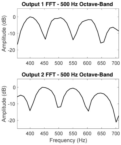 Figure 10 displays the FFT of the summed BRIRs, calculated using 4096 FFT-points and a frame length of 4096 samples (with 50% overlapping hanning windows). On inspection of the spectrum, a large notch can be seen in the low frequency region around 140 Hz, as well as smaller notches in the ‘Middle’ frequency band (up to around 2 kHz). Given the regularity of the notches, it suggests a comb-filter effect due to a first reflection interacting with the direct sound—presumably from the rubber flooring of the semi-anechoic chamber (despite placing absorption on the floor between the listener and the loudspeakers). The first frequency notch of comb-filtering when two similar signals interact can be determined by Equation (2) below. The main-layer loudspeaker was located at 1.15 m above the ground and 1.5 m from the listening position—this results in a floor reflection path of around 1.25 m greater than the direct signal, with a delay of ~3.6 ms between their arrival at the ear. From this, it is calculated that the first comb-filter notch from a floor reflection should theoretically occur at 139 Hz—the similarity between this and the large notch observed in