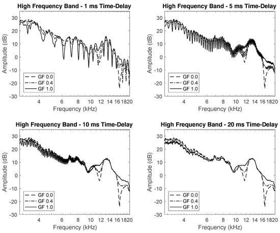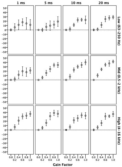 Figure 8), where larger error bars are seen for the 1 ms time-delay and a significant gain factor effect is only apparent for the 5 ms time-delay and above—the only significant difference between individual gain factor conditions for the ‘High’ band was seen with a time-delay of 10 ms.