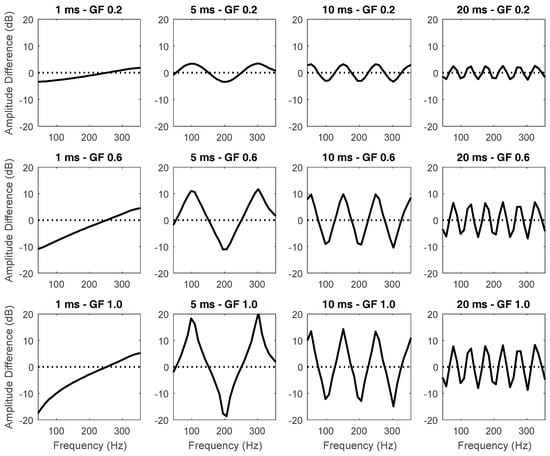 Figure 9 displays the difference of spectrum between the two output channels, with gain factors of ‘0.2’, ‘0.6’ and ‘1.0’ for each time-delay. Spectra were calculated as the long-term average FFT using 4096 FFT points and a frame size of 4096 samples (with 50% overlapping windows and no spectral smoothing). In the plots, a positive amplitude indicates a bias towards the right/height loudspeaker channel (for horizontal and vertical decorrelation, respectively), whereas a negative amplitude is a bias to the left/main loudspeaker channel.