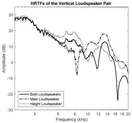 21]—where one HRIR represents the main-layer loudspeaker angle (0° azimuth, 0° elevation) and the other the height-layer loudspeaker (0° azimuth, +30° elevation). In order to observe the gain factor effect on the ear input spectrum, the HRIR-convolved stimuli spectra have been plotted in