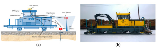 Railway engine with GPR system: (a) schematic diagram; (b) photograph.