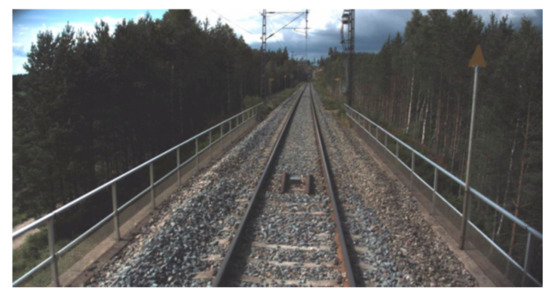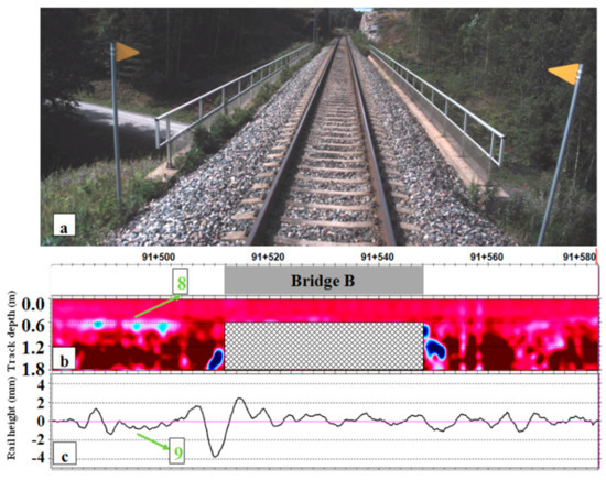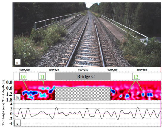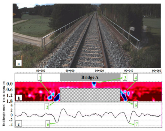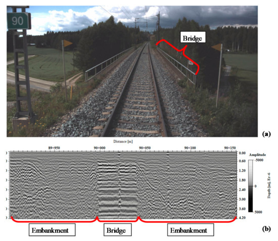 The GPR antenna can be lifted to 0.3 m above the sleeper level and the maximum survey speed is up to 160 km/h, depending on data collection settings. The data collection rate was controlled by a distance measurement instrument. During the survey, GPS coordinates and digital video were recorded using Rail Doctor™ Camlink software, developed by Roadscanners Oy, Rovaniemi, Finland. The processing, visualization, interpretation, and analysis of the GPR data are performed using the Rail Doctor software (version 3.2), developed by Roadscanners Oy, Rovaniemi, Finland, 2017. The measurement system has been calibrated against sample analysis [38] and pit tests [39]. A screenshot from the recorded video is shown in Figure 4a, wherein a transition zone consisting of embankment and a bridge can be found. A measurement result from GPR at the corresponding location is shown in Figure 4b. The right axis of Figure 4b indicates the depth, in meters, beneath the top of sleepers (or below rails). The ballast layer is located from 0 m to 0.6 m below rails, where the ballast at 0–0.25 m is between sleepers and 0.25–0.6 m is below sleepers. The subballast is located from 0.6 m to 1.2 m, and below 1.2 m is embankment and subgrade. It should be noted that sleepers are filtered during the data processing to obtain a better visualization of the data. The lateral axis of Figure 4b is the distance or location, which is in the form of “km + m”. The two sides of the bridge in a transition zone are named as the embankment-bridge side and the bridge-embankment side in the paper depending on the train moving direction. The moving directions of the results presented in this paper are all from left to right. Therefore, the embankment-bridge side is always on the left side of bridges (before the bridges) and the bridge-embankment side on the right side (after the bridges).