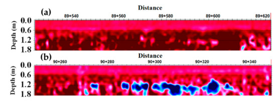 Dielectric properties decide the amplitude, arrival time, and signal attenuation of reflections, and they are different with a higher content of fines and water [42]. The dielectric constant and the velocity of the signal in various materials are shown in Table 1 [43]. This difference can be detected by analysing the GPR signal [38,43,44]. As a result, the distribution of the relative moisture susceptibility in ballast and subballast can be obtained.