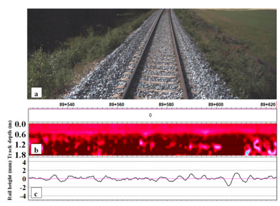 Measurement results of open track: (a) photograph of the track; (b) the moisture profile; and, (c) the longitudinal track level.