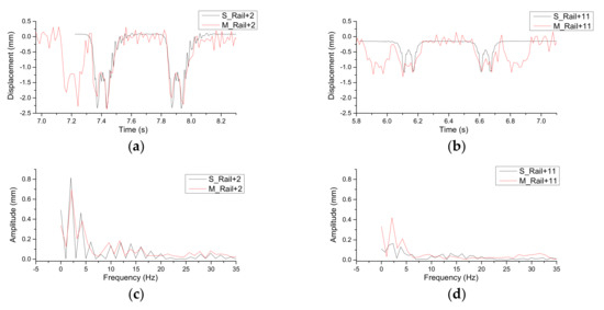 Comparisons of measurement and simulation results: (a) the rail close to the bridge in the time domain; (b) the rail far from the bridge in the time domain; (c) the rail far from the bridge in the frequency domain; and, (d) the rail close to the bridge in the frequency domain.