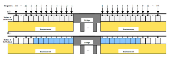 Ballast in transition zones often has poor drainage conditions [1,6,22]. High moisture in the ballast leads to an approximately 50% reduction in stiffness [27,28]. Therefore, the model considers ballast with high moisture in the transition zone by reducing stiffness by 50%. In this case, ballast areas in the transition zones assumed to be affected by high moisture (50% stiffness reduction) are within an 8-sleeper distance from the bridge and are shown with blue colour in Figure 13. The ballast stays unchanged in the reference case.