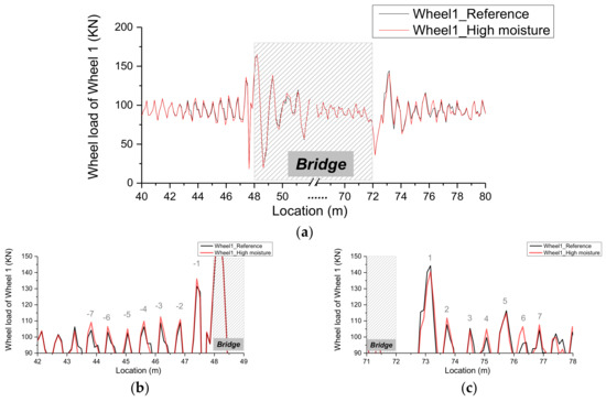 The dynamic wheel loads of Wheel 1 are shown in Figure 14. The horizontal axis represents the distance along the transition zone model, where the bridge is located between 48 m and 72 m. Dynamic wheel loads on the bridge are not analyzed here, and therefore their responses are covered by the shaded area. The dynamic wheel loads are zoomed before and after the bridge in Figure 14b,c, respectively.