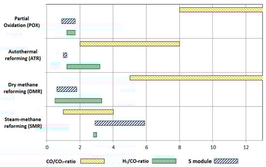 Range of the syngas composition for the commercially applied methane reforming technologies. The composition is expressed by the three main stoichiometric modules.