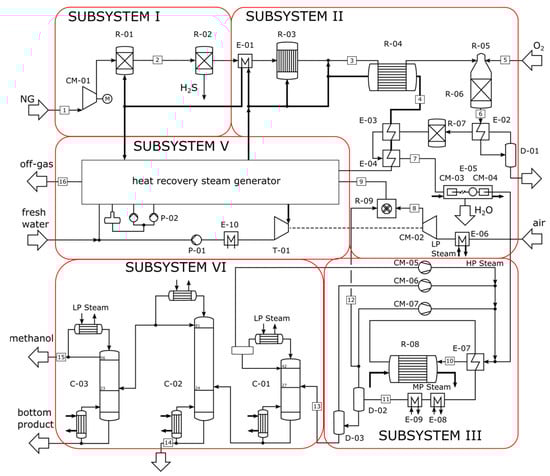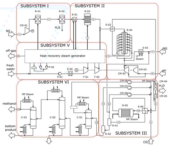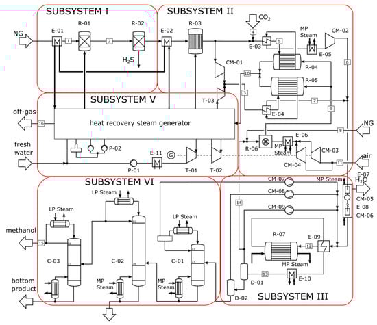 Process flow sheet of the methanol plant with steam–methane reforming (Case I).