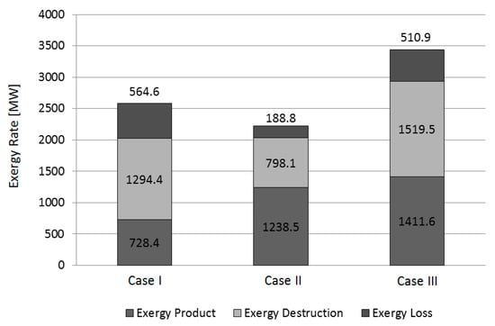 A conventional exergetic analysis is conducted to evaluate the real inefficiencies within the processes. The bar chart in Figure 6 shows a comparison of the results of the exergy analysis for the three design cases.