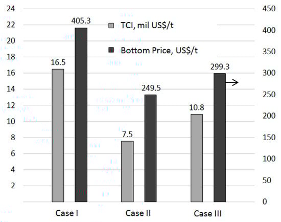 The total revenue requirement method is applied to evaluate the processes from an economic point of view. Figure 7 presents a comparison of the specific total capital investment and the cost per ton of produced methanol. The cost is calculated as the ratio of the TRR and the capacity of the plant.