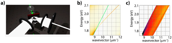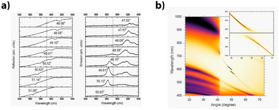 A prism coupler in Kretschmann configuration has been used for the reflectance and emission mapping of the signal lying beyond the critical angle (Figure 1a). The energy dispersion map is obtained by projecting the back focal plane of the detection lens on an imaging CCD camera placed after a spectrometer—which allows for energy resolution. In the case of the reflection map, the excitation line consists of a white light source focused on the sample (throughout the prism side) and the reflected signal is collected using a goniometric system (Figure 1a). The photoluminescence dispersion map uses the same detection line described above, but a 532 nm cw-laser source is focused on the mono-layer and bi-layer directly from the top deposition side.