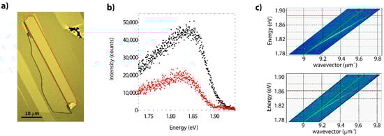 Instead of the prism-coupler, a leakage radiation microscope is necessary when detecting the spatial distribution of the polaritons in the plane of the device. This detection system consists of an oil immersion microscope objective placed at the substrate side in order to extract signals lying in the total internal reflection regime. An out-of-resonance excitation source (532 nm) is focused on the sample surface by means of a second microscope objective placed at the deposition side (Figure 4a). The sketch of the optical setup is in Figure 4a.