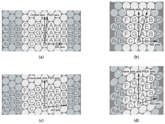 The four layouts that result from these transformations are illustrated in Figure 1a–d. Each figure shows how pitches are positioned, and the orientation of three axes that we hypothesize will impact on the layout’s usability. Each label indicates whether the layout has adjacent major seconds or not (A and , respectively) and whether it is sheared or not (S and , respectively). The three axes are the pitch axis, the octave axis, and the major second axis, as now defined (the implications of these three axes, and why they may be important, are detailed in Section 1.1.2).
