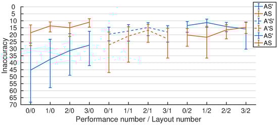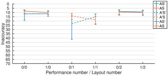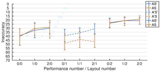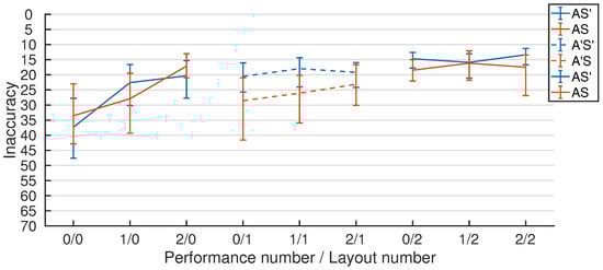The significant coefficients for LayoutNo (), PerfNo (), and their interaction LayoutNo:PerfNo () indicate that accuracy in the transfer task improves over successive layouts and performances, but less so when either is high. In Figure 5, the positive gradient of the slopes in the first layout block (0/0, 1/0, 2/0, 3/0) appear greater than those of the second (0/1, 1/1, 2/1, 3/1) and third (0/2, 1/2, 2/2, 3/2) blocks; the inaccuracy measured at the beginning of each layout block (performance 0) also appears to increase across layout blocks 0–2, but less so with later performances.