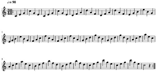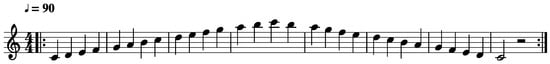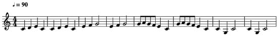 Melodies for musical tasks were chosen to be single-line sequences to be performed solely with the right hand. The training melodies consisted of a set of C major scales (Figure 7) and a set of arpeggios (again only using the notes of the C major scale—Figure 8) spanning two octaves, and all starting and ending on middle C. The well-known nursery rhyme Frère Jacques was used as the transfer task melody (Figure 9); it too was played in C major and began and ended on middle C.