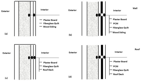 Construction of the building envelope: (a) wall without Phase Change Material (PCM); (b) wall with PCM; (c) roof without PCM; and (d) roof with PCM. PCM: phase change material