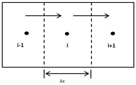 Assuming fixed state conditions (Figure 3), thermal conduction for the control volume “i − 1” to control volume “i” can be computed by Fourier’s equation. During a time-step, the increase in the enthalpy by the control volume “i” is summed by Equation (2). Equation (1) is included in Equation (2) to obtain Equation (3) and to expression about the specific changes in enthalpy as a temperature change multiplied by the specific heat capacity. Based on the user input data and Equation (4) the specific heat can be updated in each iteration using the Enthalpy–Temperature function. Through these processes, the node enthalpies are updated at each time step, and the changing characteristics of PCM can be accurately analyzed. In the CondFD algorithm, all elements are divided or discretized using Equation (5), which depends on a space discretization constant c, the thermal diffusivity of the material α, and the time step. The default space discretization value of three (equivalent to a Fourier number (Fo) of 1/3) has been used [19,48].