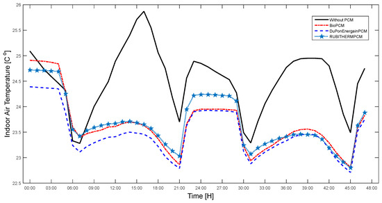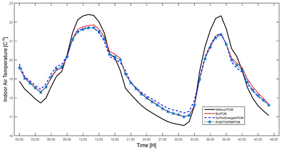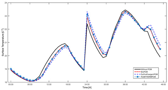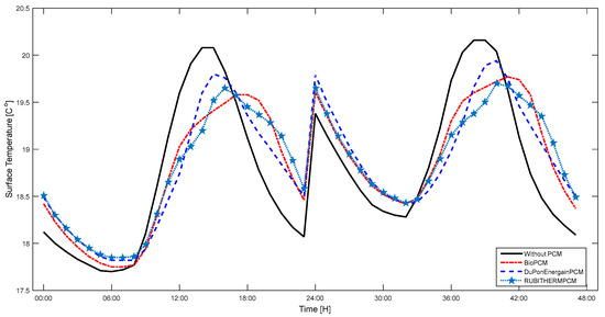 Three types of the phase change materials, BioPCM [51,52], DuPonEnergainPCM [48,53] and MRUBITHRMPCM [3,54,55], were selected to serve as the PCM which is contained in the supporting materials, Table 3. Their melting points vary: 29 °C fo BioPCM; 21.6 °C for DuPonEnergainPCM); and 25 °C for RUBITHRMPCM. Moreover, they vary in their heat capacity, and, as previous studies [3,40,51,52] reported, these materials can store a large amount of energy in short temperature ranges when incorporated into a building envelope.