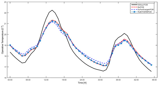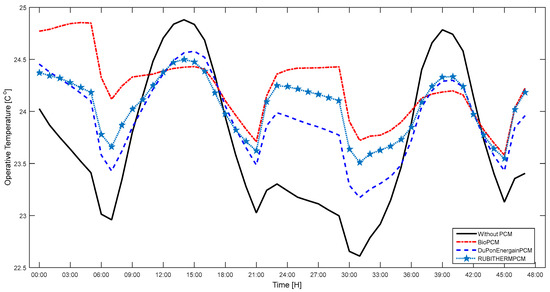 To get a more comprehensive view of the improved sense of comfort offered by the PCMs, a deeper analysis simulated the charging and discharging processes in the building envelope (Figure 12, Figure 13, Figure 14 and Figure 15) to evaluate the indoor air temperature and operative temperature in the building. The charging and discharging processes during the night and day on the southern and eastern walls are significant, as shown by the variations between the walls with and without PCM. Including a PCM in the building envelope achieved significant benefits. Moreover, the charging and discharging processes during the night and day affected the surface temperature and operative temperature within the building, as shown in Figure 6, Figure 7, Figure 8, Figure 9, Figure 10 and Figure 11. Without PCM (Figure 12, Figure 13, Figure 14 and Figure 15), the charging and discharging processes were negligible, which explains the ups and downs in the surface temperature and operative temperature throughout the night and day.