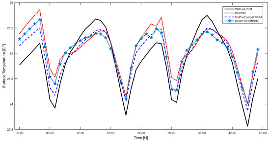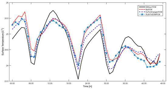 Effect of PCMs on the surface temperature (14–15 August), south wall, Seoul.