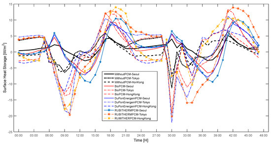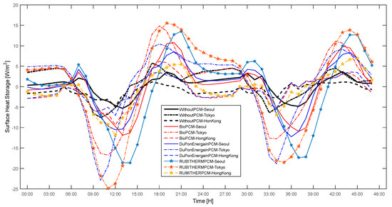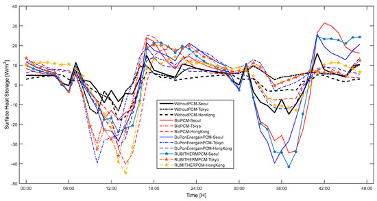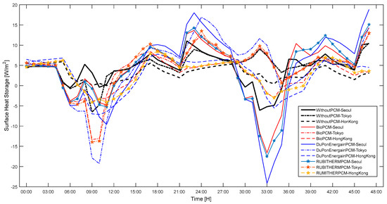 Effect of PCMs on surface heat storage (14–15 August), south wall, Seoul.