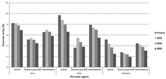 For Seoul, electricity savings by BioPCM in present, 2020, 2050 and 2080 were shown to be 8.21%, 8.18%, 7.81% and 6.91% respectively and RUBITHERMPCM in present, 2020, 2050 and 2080 were shown to be 6.53%, 6.95%, 6.62% and 5.82% respectively. For Tokyo, electricity savings by BioPCM in present, 2020, 2050 and 2080 were shown to be 9.69%, 8.78%, 7.94% and 6.60% respectively and RUBITHERMPCM in present, 2020, 2050 and 2080 were shown to be 7.89%, 7.32%, 6.53% and 5.48% respectively. For Hong Kong, electricity savings by BioPCM in present, 2020, 2050 and 2080 were shown to be 5.15%, 4.37%, 3.71% and 2.49%) respectively and RUBITHERMPCM in present, 2020, 2050 and 2080 were shown to be 4.45%, 4.17%, 3.79% and 3.10%, respectively.