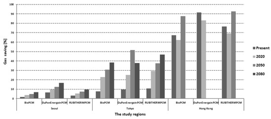 For Seoul, gas savings by BioPCM in present, 2020, 2050 and 2080 were shown to be 1.65%, 3.61%, 4.75% and 6.77% respectively and RUBITHERMPCM in present, 2020, 2050 and 2080 were shown to be 3.25%, 5.51%, 7.36% and 9.72% respectively. For Tokyo, gas savings by BioPCM in present, 2020, 2050 and 2080 were shown to be 7.60%, 22.94%, 30.13% and 38.43% respectively and RUBITHERMPCM in present, 2020, 2050 and 2080 were shown to be 10.63%, 29.44%, 37.62% and 46.86% respectively. For Hong Kong, gas savings by BioPCM in present, 2020, 2050 and 2080 were shown to be 67.20%, 62.07%, 88.33% and 0.00% respectively and RUBITHERMPCM in present, 2020, 2050 and 2080 were shown to be 76.92%, 69.40%, 93.33% and 0.00%) respectively.