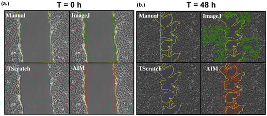 Figure 1 shows the segmentation, obtained with every considered method, of two representative images acquired at 0 and 48 h post scratch. While at the beginning of the experiment (Figure 1a), the results are equivalent and coherent with the ground truth (reported in yellow in Figure 1), at the end of the experiment (Figure 1b), there is a significant variability, with the wound area obtained with ImageJ being notably larger than the ground truth. This is caused by the loss of regularity of the cell front that leads to the generation of a large number of false positives in the analysis with this method.