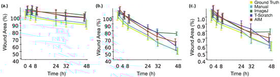 Besides comparing the average wound areas obtained with each method and presented as the mean and standard error, the percentage difference with respect to the ground truth was computed (Equation (3)).