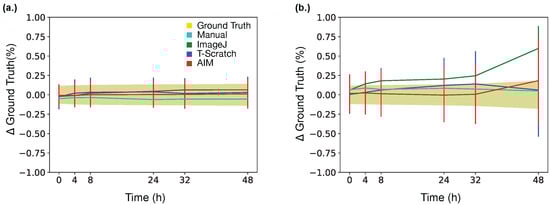This quantity (Equation (3)) is a measure of the distance between the result of each method and the true wound area and thus was computed only considering the images for which this result was available (about 40% of the total). Again, we can notice that all the methods are equivalent for the control condition (Figure 3a), as both their average value and standard error are coherent with the intrinsic variability of the considered dataset. This was quantified as the standard deviation of the ground truth and is reported in Figure 3 as the shaded area. On the other hand, the TGF-1 condition (Figure 3b) is associated with an increase in variability both within each method and among them. In particular the mean percentage difference between the ImageJ macro and the ground truth exits the shaded area 8 h after the beginning of the assay, and 34 h later, the average wound extension recorded by this method is almost 1.5-fold larger than its true value.