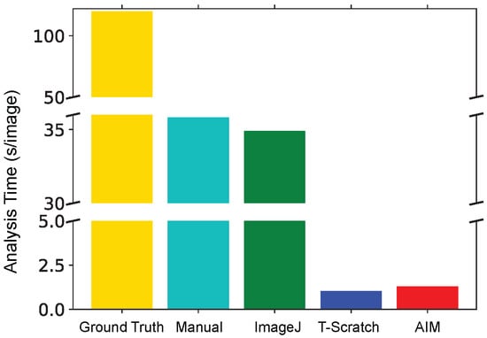 The manual analysis and the one based on the ImageJ macro were highly time consuming with an average of about 35 s/image, therefore resulting in a total elaboration time of about 10 h per method. The definition of the ground truth, the manual tracing of the wound edges, was more than three-times as expensive and thus was only applied to a subset of images corresponding to about 40% of the total (half of the images of three among the four replicates). TScratch and AIM are considerably faster than all the other techniques with an average analysis time between 1 and 2 s/image. These methods are also associated with an increased automation of the analysis and thus with a lower dependency on the user. This is a desirable characteristic especially when a large number of experimental conditions and time points must be considered.