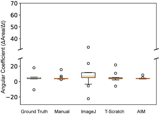 On the other hand, AIM was characterized by a remarkable capacity of reliably estimating the angular coefficient independently of the time course. In this case, only two outliers were recorded, both very close to the narrow main distribution. This result is likely to be connected with the filtering effect of local operations, which assigns to each pixel the result of an operation on its neighborhood. The relation between wound area and time will thus be more linear and less dependent on factors such as cell density and the regularity of the cell front. This, in turn, will lead to a stable and reliable estimation of the angular coefficient.