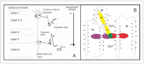 As shown in Figure 1A, the influx of positive ions into each individual dendrite now causes an equivalent number of positive ions to flow out of the cell near the cell body. Thus, a transient “equivalent dipole” between the surface of the brain and deeper layers of extracellular fluid is generated. Again, the green area of Figure 1B shows diagramatically how this dipole becomes much larger if a number of incoming axons fire synchronously. This effect is solely a consequence of basic neuroanatomy. It occurs because all of the apical dendrites are anatomically aligned.
