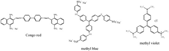 The main materials used for the synthesis of MNPs were as follow: nano Fe3O4 (99.5% metals basis, 20 nm particle size), tetraethyl orthosilicate (TEOS), and (3-aminopropyl) triethoxysilane (APTES), which were purchased from Alladin Reagent Co., Ltd. (Shanghai, China). Triton X-114 (C30H64O9, relative molar mass is 558.75 g/mol, CMC is 0.35 mmol/L at 25 °C)was purchased from Alladin Reagent Co., Ltd. The dyes of Congo red (CR), methyl blue (MB), and methyl violet (MV) were purchased from Alladin Reagent Co., Ltd., and the chemical structures of the three dyes are shown in Figure 1. Other reagents were of analytical grade and used without further treatment. Deionized water was used to prepare the sample solutions.